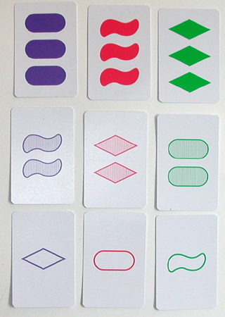– 81 cartes avec des symboles différents combinant quatre caractéristiques : forme – vague, ovale, losange;  couleur – rouge, vert, violet ;  nombre – une fois, deux fois, trois fois le symbole; état – plein, vide, hachuré.