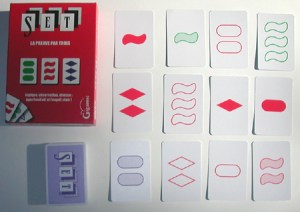Qu’est ce qu’un « set » : Un set est un ensemble de trois cartes dont chacune des quatre caractéristiques est soit totalement identique, soit totalement différente aux deux autres cartes. Les caractéristiques sont : la forme, la couleur, le nombre et l’état de remplissage.