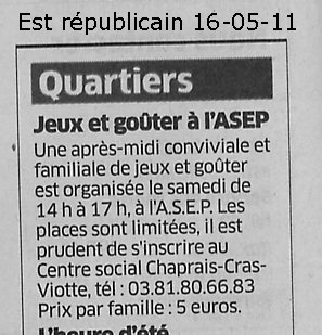 amedi 21 mai de 14h à 17h00 à l’ASEP.