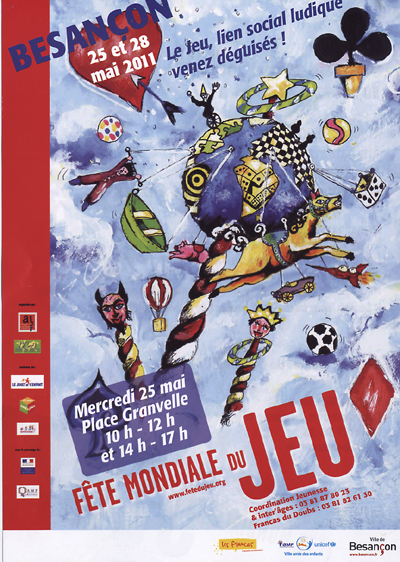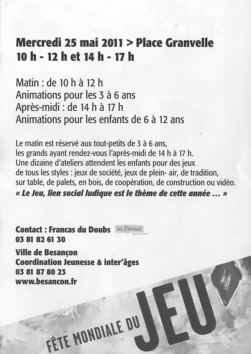 Les FRANCAS du Doubs ainsi que plusieurs autres intervenants seront présent pour cette nouvelle Fête du Jeu 2011. Comme chaque année, plusieurs stands seront proposés pour jouer. Culture Jeux aura un stand le matin.