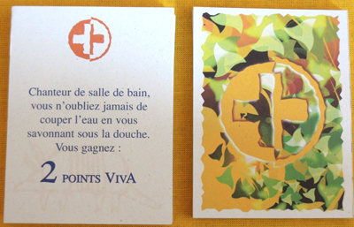 4- Le premier joueur dévoile ensuite la vrai réponse ainsi que le commentaire de la carte. Tous les joueurs ayant répondu de façon correct vont gagner un ou plusieurs points « Viva » de(s) couleur(s) de la case où se situe leurs pions. On tire pour cela une carte « + ». Sur celle ci , en plus du gain, il y a une remarque pour faire un geste pour préserver notre planète. En cas de mauvaise réponse, on gagne rien.