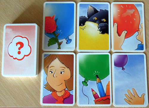 C’est un jeu simple mais vraiment intéressant pour les enfants de 3-4 ans. Lors des premières parties, il se peut que certains pleurent la perte de ces ballons. Moi j’ai changer la façon de gagner le jeu. Tout le monde gagne sauf celui à qui a perdu tous ces ballons. Avec ce jeu, les enfants apprennent à perdre, la reconnaissance des couleurs et aussi à décrire. Je leur fait expliquer l’action qu’il voit. Ça prend plus de temps mais l’enfant se sent plus impliqué dans le jeu. Et quand arrive la gentille maman… C’est la joie des mamans qui jouent. Une variante pour les plus grands avec laquelle je joue aussi : quand on n’a pas de ballon de la couleur de la carte action, on peut crever celui d’un autre. Ça devient plus dynamique, et la fin plus rapide !