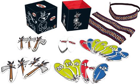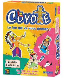 Vous ne rêvez pas, voici une ré-édition du jeu Coyote édité par Tilsit. Dans la version précédente, le but était de ne pas se faire déplumer, c’est à dire perdre ces 3 plumes qu’on avait sur la tête. Dans la nouvelle version, plus de plumes, mais ce sont des tomahawks qui sont « lancés » sur la tête des perdants. Le joueur ayant reçu trois tomahawks est sorti du jeu. Le dernier joueur en lice gagne la partie après avoir fait exclure tout ses camarades.