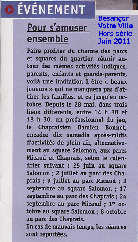 Voilà une petite surprise. Ce matin je découvre dans le magazine de la municipalité de Besançon, un article sur mes activités de cet été. Ça fait le deuxième. J’espère que cela portera ces fruits et que j’aurai encore plus de monde !
