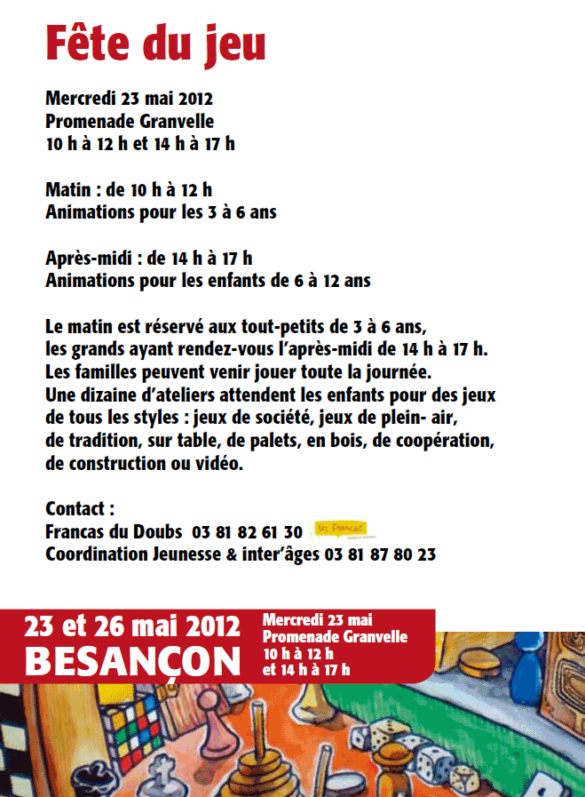 Voici le programme de la fête du jeu 2012 qui aura lieu sur la place Granvelle à Besançon. Cliquez sur l’image pour le voir plus en détail. On compte sur vous pour venir jouer avec nous.