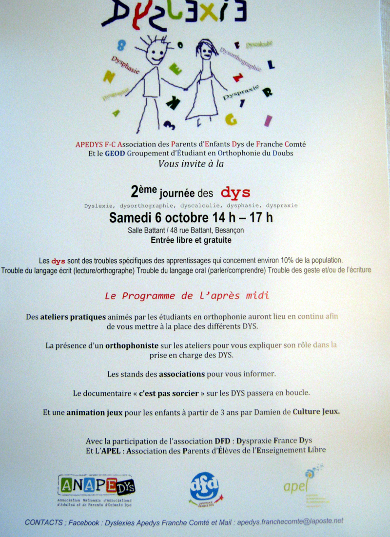 Samedi 06 octobre de 14h à 17h Salle Battant / 48 rue Battant à Besançon à lieu la 2ème journée des DYS ( dyslexie, dysorthographie, dyscalculie, dysphasie, dyspraxie).