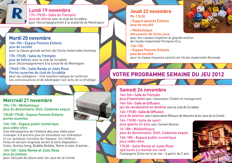 Samedi prochain, le 24 novembre, a lieu tout un tas d’animations jeux dans à la maison de quartier de Montrapon de Besançon. Elles clôturent la semaine du jeu dans le quartier. Les animations de la semaines étaient tournées vers les scolaires.