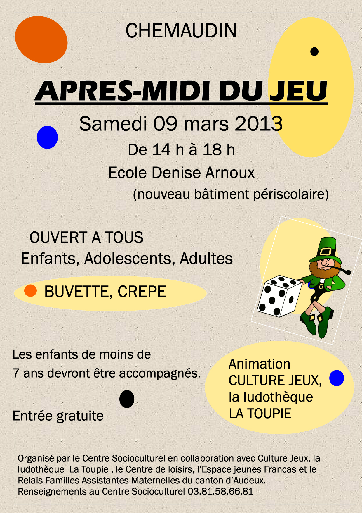 Depuis plusieurs année, mars rime avec jeux à Chemaudin. Mais cette année nous seront installé dans les nouveaux locaux du périscolaire de l’école Denise Arnoux.