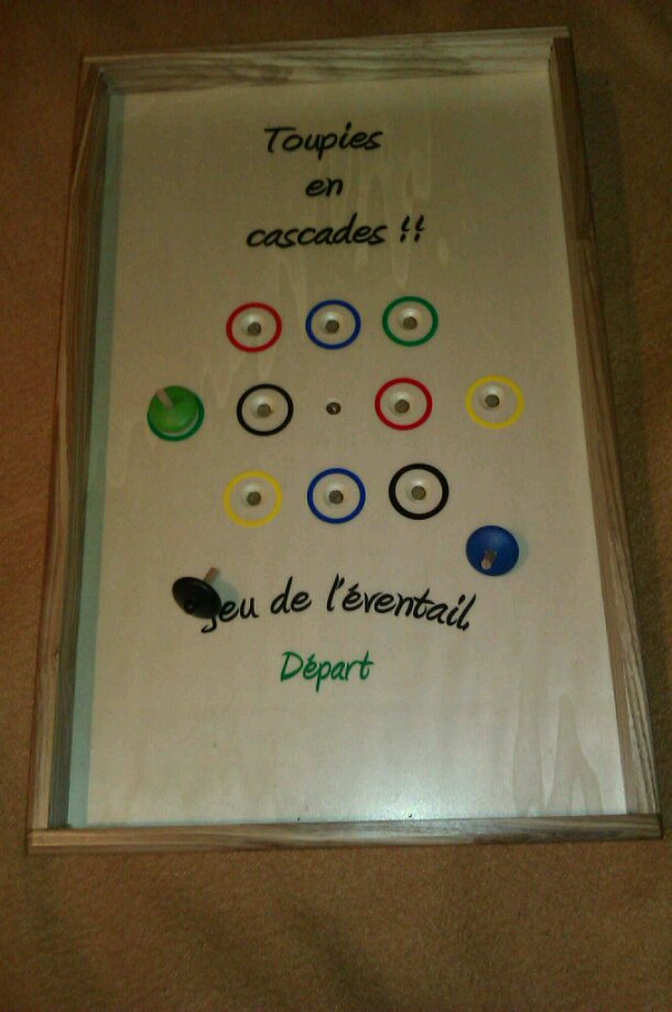 Une boule en-dessous permet d’incliner le plateau pour guider sa toupie. But: ranger les dix toupies dans les bons trous en moins de trois minutes. Bémol: le sablier n’est pas fourni…