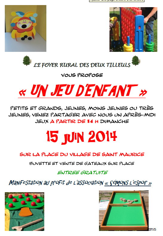 Dimanche 15 juin après midi, le village de Saint Maurice Crillat dans le jura organise une après midi jeux au profit de l’association « semons l’espoir ».
