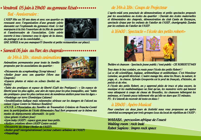La saison des fêtes de quartier commence à Besançon. L’une des premières est la fête de quartier de Chaprais Cras Viotte. Cette année, on fêtera aussi les 50 ANS de l’ASEP qui organise cette fête chaque année de main de maitre !